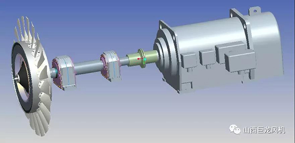礦用短軸主扇風(fēng)機(jī)的葉輪安裝在傳動(dòng)組的主傳動(dòng)軸上,配套軸承按葉輪運(yùn)轉(zhuǎn)所產(chǎn)生的徑向和軸向載荷進(jìn)行合理配置,滿(mǎn)足風(fēng)機(jī)長(zhǎng)期安全運(yùn)行需求;電機(jī)主軸及軸承只承擔(dān)因扭矩驅(qū)動(dòng)和自身轉(zhuǎn)子重量產(chǎn)生的載荷,而不再額外承載其他負(fù)載(電機(jī)設(shè)計(jì)規(guī)范,明確電機(jī)軸不得承受徑向和軸向載荷),為保證電機(jī)在設(shè)計(jì)壽命范圍內(nèi)安全運(yùn)行提供了條件。